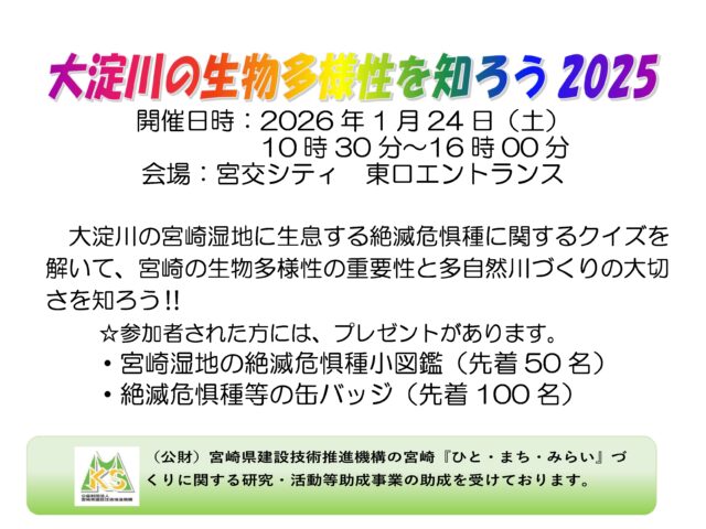 大淀川流域の環境保全のため、大淀川の支流を含む各所において水質調査や水辺環境調査、モニタリングなど各種の調査を行い、その調査結果をお知らせしています。また、学習・体験イベントとしての活動や、希少生物などの保全活動にも取り組んでいます。