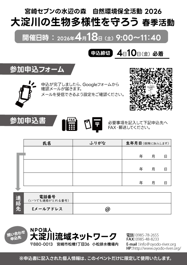 申込書はこちらからダウンロードできます。大淀川の生物多様性を守ろう_申込書.PDF