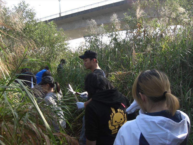 宮崎市内の親子や宮崎総合学院のボランティアの皆様にご協力いただき、タコノアシの生育を邪魔しているヨシやオギなどの刈取りを行いました。