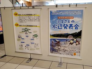 宮崎県内の皆様が、五感を使った水辺環境指標を使用して調査した様子のパネルを展示しています。