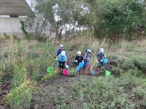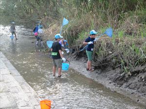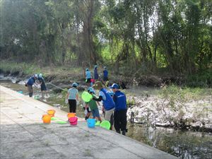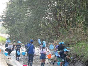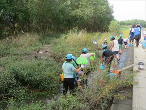 天満橋下の小川の水辺にどんな動物がどこにすんでいるかを調べて、保全方法について考えました。