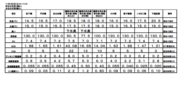 11月の水質測定の結果をお知らせします 2015-12-03 都城河川水質改善プロジェクト 水質測定の結果をお知らせします。 実施は、本プロジェクト協議会構成員の県立都城工業高等学校の皆さまです。 県立都城工業高等学校の生徒さんが、11月14,15日に行われた高校生ものづくりコンテスト全国大会化学分析部門で全国2位になりました。 データーは下記のようです。 共有:FacebookXいいね:いいね 読み込み中… 前の記事記事一覧次の記事 ホーム都城河川水質改善プロジェクト11月の水質測定の結果をお知らせします
