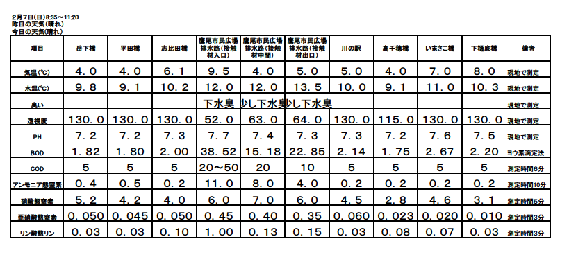 2月の水質測定の結果をお知らせします 2016-03-14 都城河川水質改善プロジェクト 水質測定の結果をお知らせします。 実施は、本プロジェクト協議会構成員の県立都城工業高等学校の皆さまです。 データーは下記のようです。 共有:FacebookXいいね:いいね 読み込み中… 前の記事記事一覧次の記事 ホーム都城河川水質改善プロジェクト2月の水質測定の結果をお知らせします